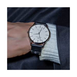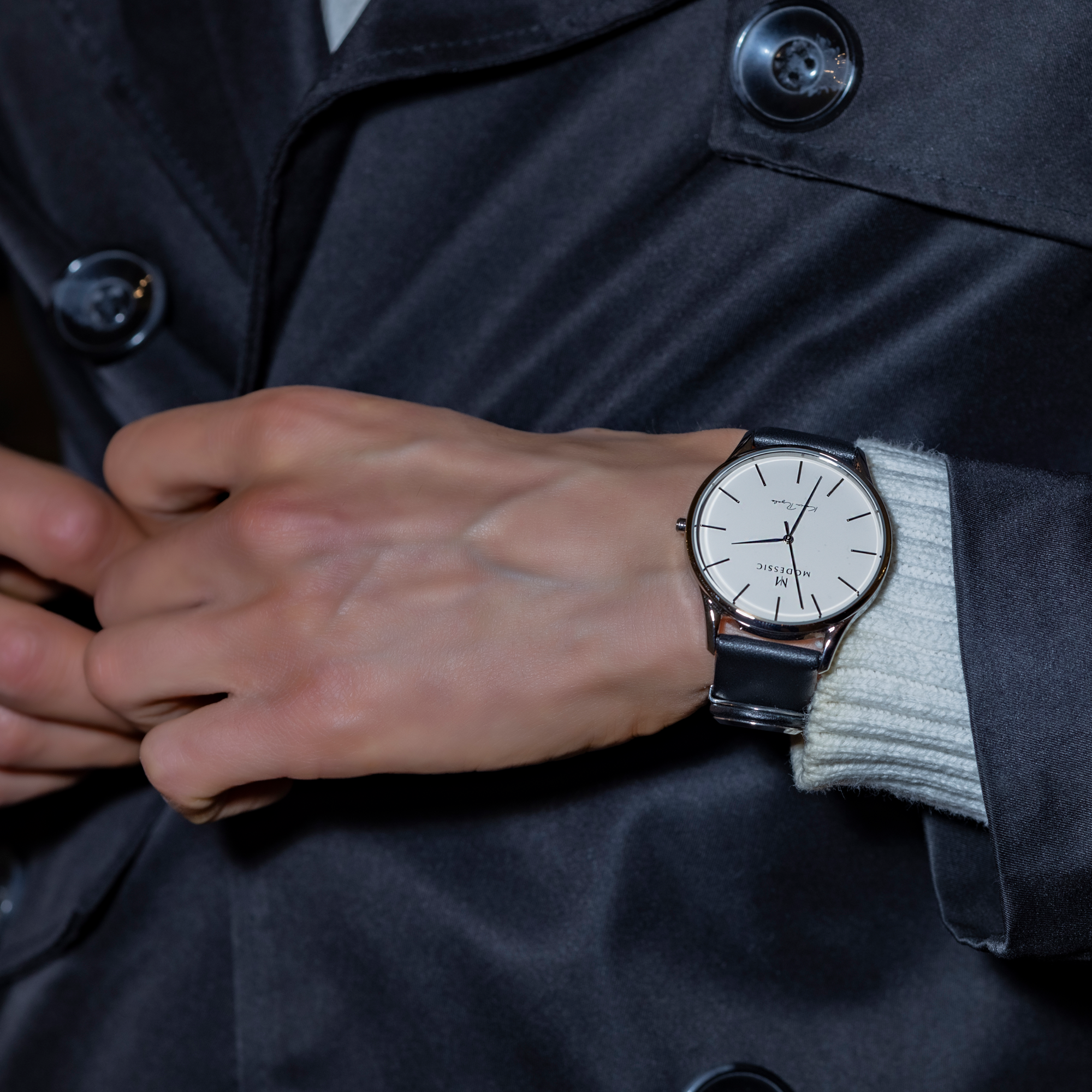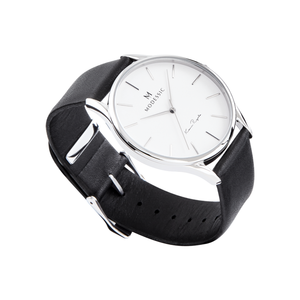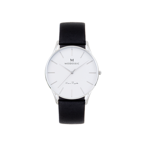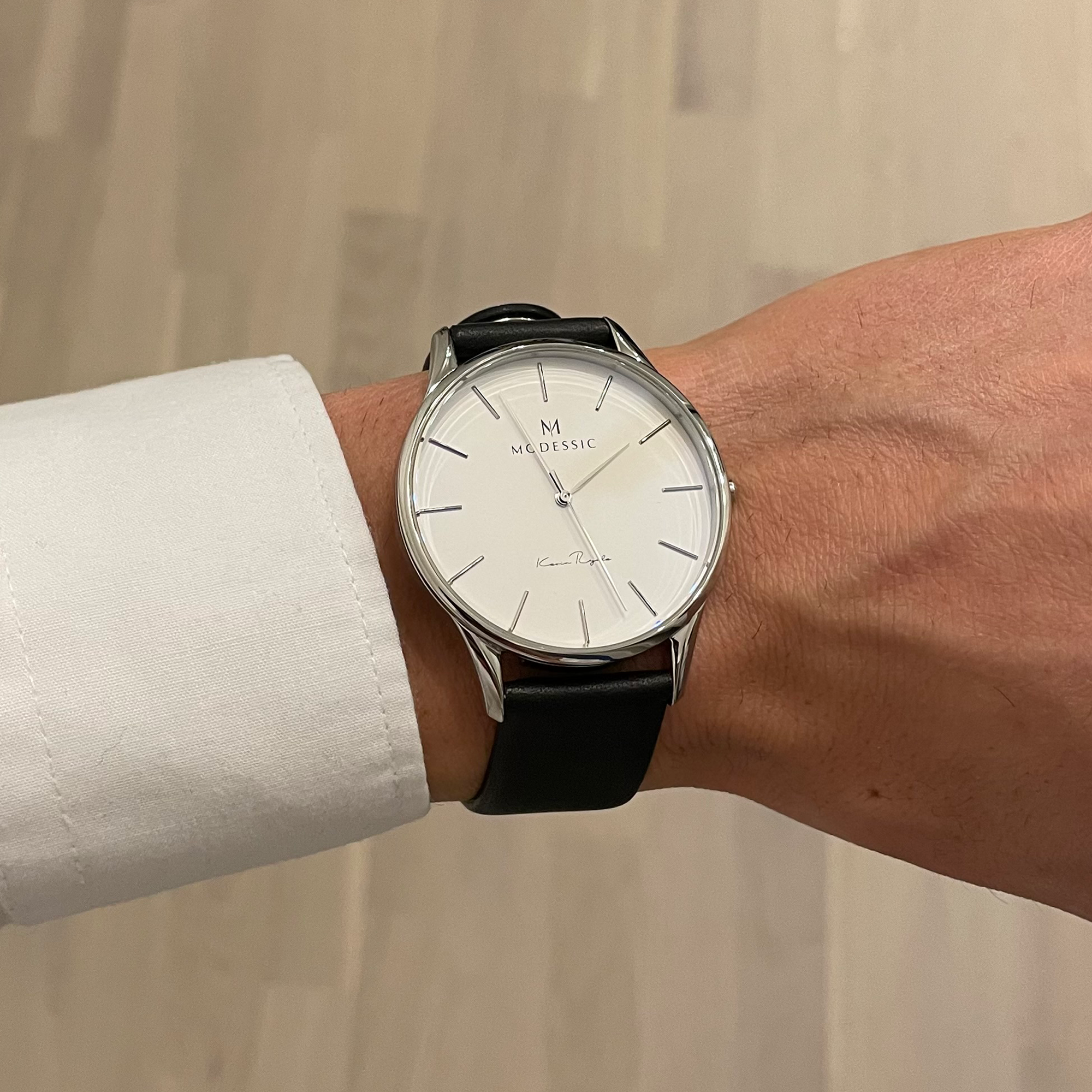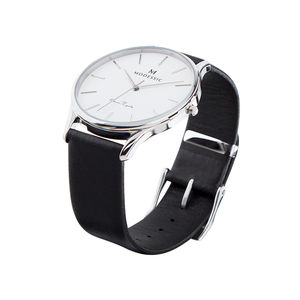 The watch's 40 mm case, clasp, hands and index are made of stainless steel. The white dial and black leather watch strap create a nice contrast.