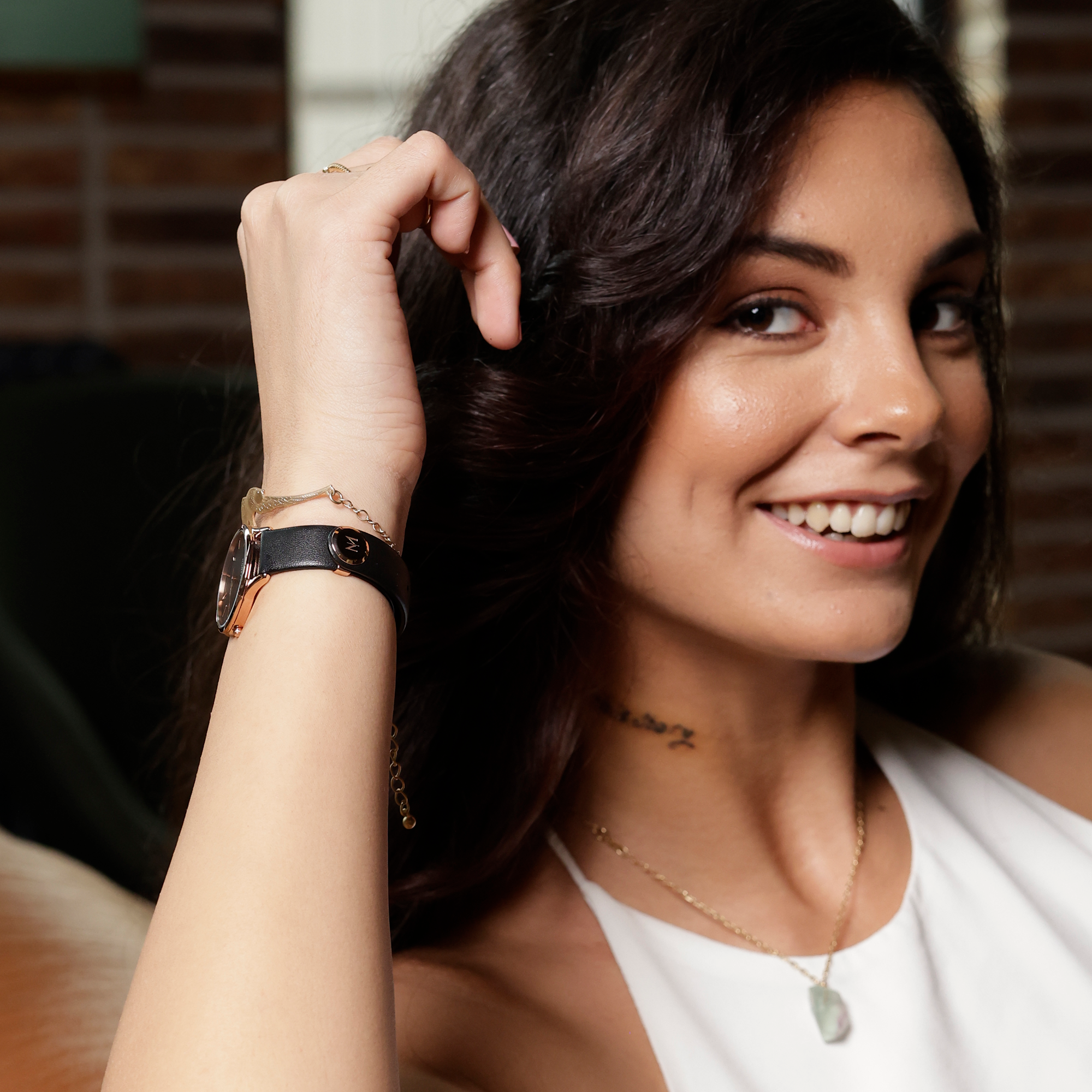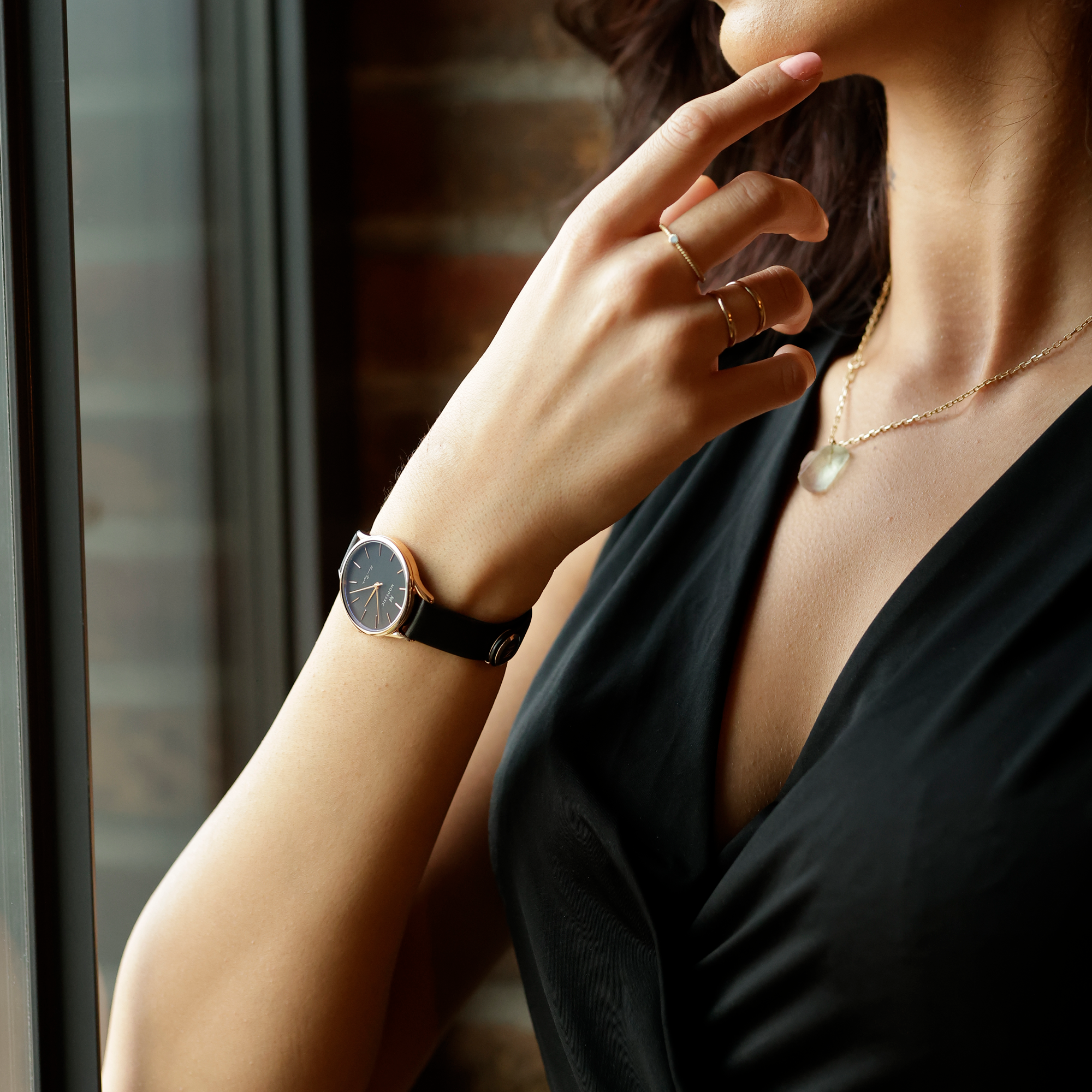 The Rose Noir watch and Shadow watch band create a stylish and elegant look. The combination makes a striking impression that works in any setting, from casual weekends to dressed-up parties and important business meetings.
