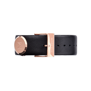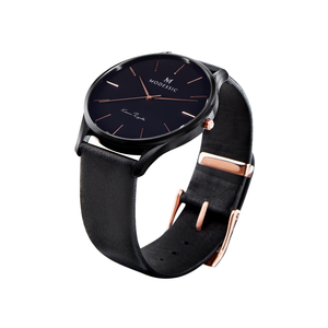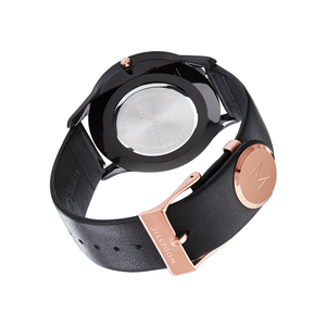 This classic watch features a matte black dial, a 40 mm brushed black case and rose gold hands, clasp and hour markers. The stylish design is complemented by a black leather watchband.